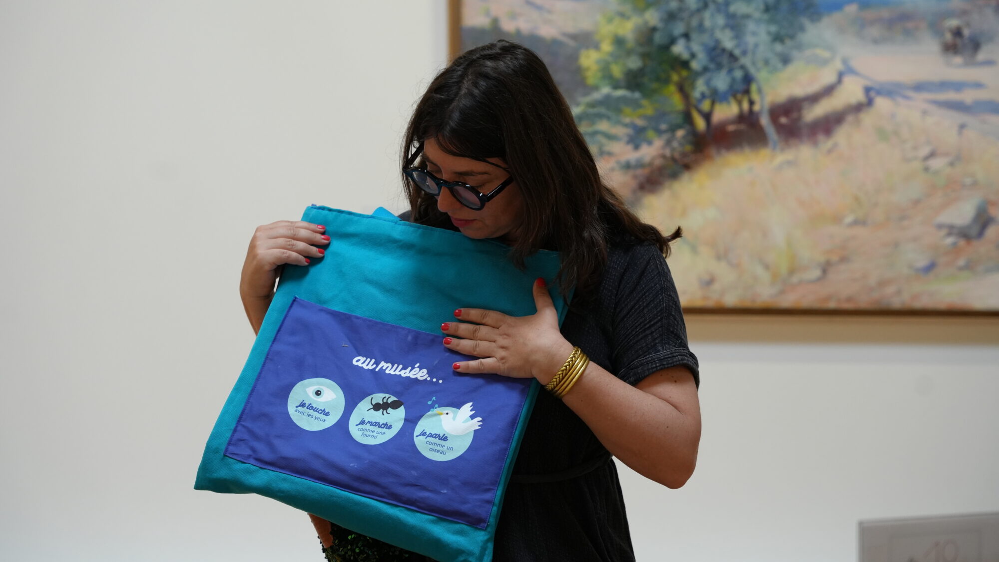 A l’intérieur, une boite à histoire avec des jeux, et lorsqu’on le déplie, un tapis d’éveil apparait ! Selon la thématique proposée différentes formes de jeux sont disponibles : des cherches et trouve en forme de carte postale ou feutrine de couleur, des bonhommes à habiller selon la météo, une valise à remplir selon le tableau exploré ou encore des figurines d’animaux à retrouver dans les œuvres…