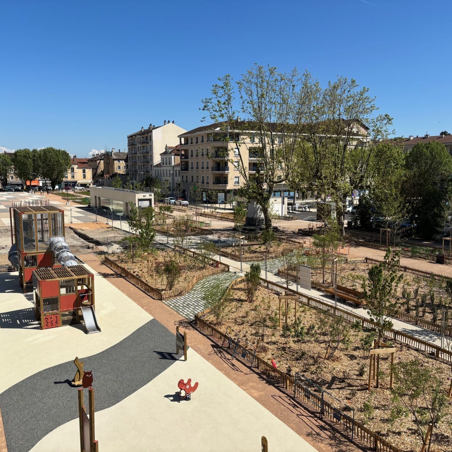 Ce jeudi 30 avril, l’aire de jeux sur la place du Promenoir a été ouverte ! Un lieu sécurisé de près de 250m² pour les enfants caladois !