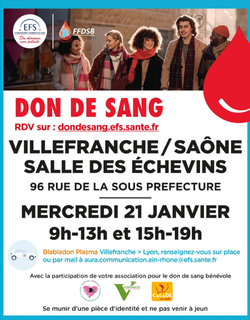 Rendez vous, mercredi 21 janvier de 9h à 13h et de 14h à 19h à la salle de Echevins à Villefranche, pour la traditionnelle collecte de sang.